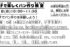 岩野田児童センター『親子で楽しくパン作り教室』4歳以上の幼児親子・小学生親子対象