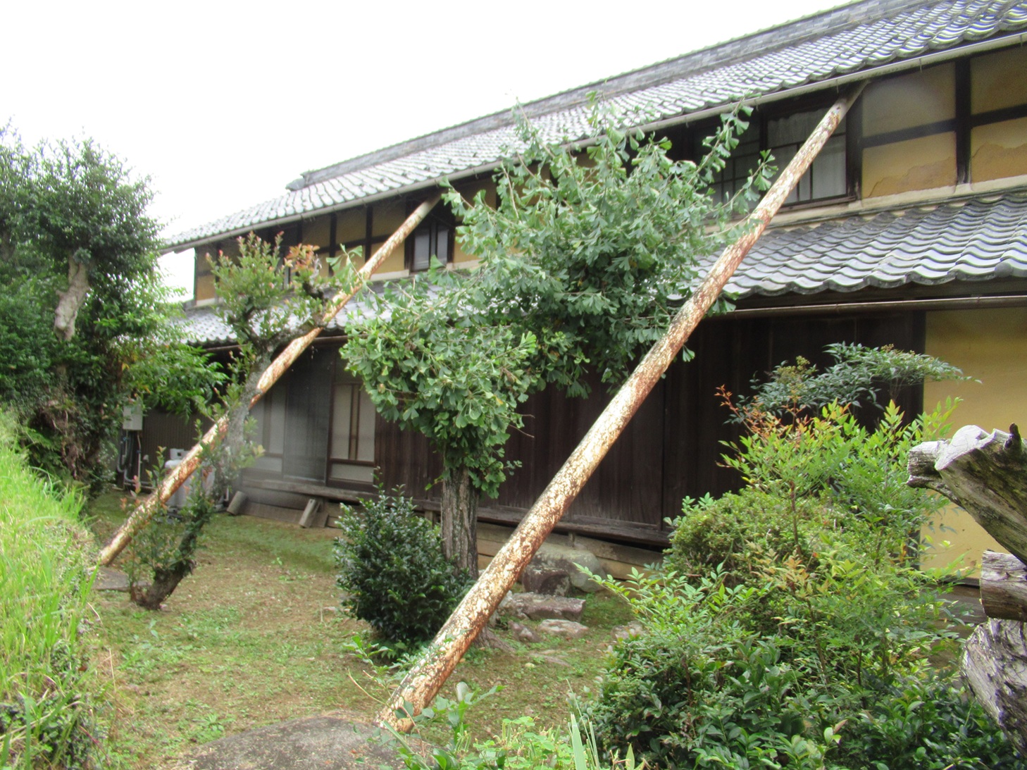 二階建ての大きな日本家屋は、二階部分の傾きが大きく、そのままでは倒壊の恐れもあり “建て起こし工事”を行いました。柱にうがたれたほぞ穴は変形しており、たとえ修復工事で傾きを直しても、すぐに元に戻ってしまうので、家の外に大きな頑丈な鋼材や鋼管を、つっかえ棒として立てました。